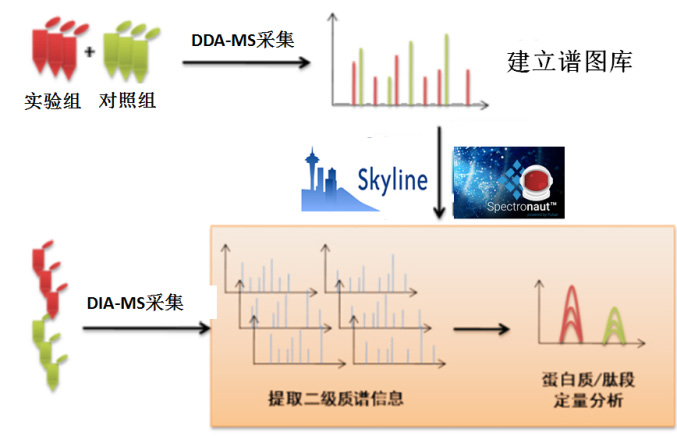 非数据依赖采集蛋白质组分析 DIA(data independent acquisition)/SWATH(sequential window acquisition of all theoretical fragment ions)蛋白质组分析技术, 是将整个质谱扫描质量范围分为若干个质量窗口,再依次对每个质量窗口的所有离子进行碎裂并采集全部子离子的质谱信息。该技术无需指定目标肽段,扫描点数均匀,利用谱图库即可实现定性分析和定量离子筛选,同时可实现数据回溯。